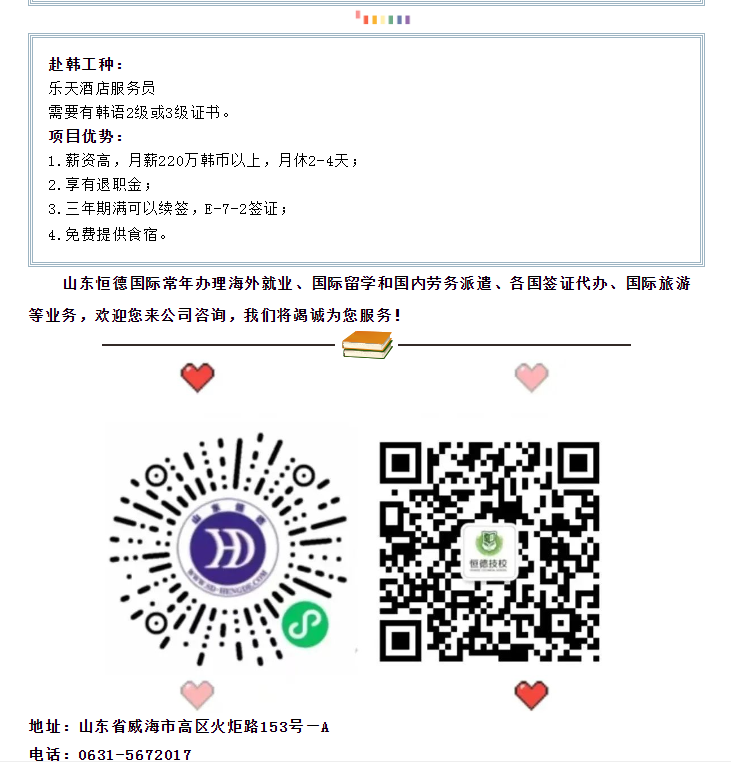 版權(quán)所有:山東恒德國際經(jīng)濟(jì)技術(shù)合作有限公司 威海恒德職業(yè)培訓(xùn)學(xué)校 地址:威海市高區(qū)火炬路153號-A 免費(fèi)熱線:4006150009電話:(韓國部)+86-631-5672008(日本部)+86-631-5672006 (新加坡)+86-631-5672009 (留學(xué)部)+86-631-5672011 傳真:+86-631-5672028 郵 編:264209 郵箱:hengdeguoji@163.com51La| 策劃制作:威海雷迅網(wǎng)絡(luò) 魯ICP備19060589號 魯公網(wǎng)安備 37100302000191號